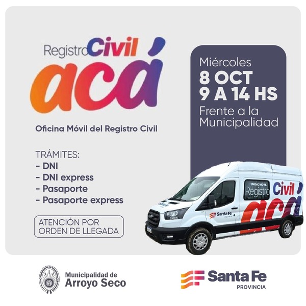 El Gobierno Municipal de Arroyo Seco informó que mañana, miércoles 8 de octubre, estará la Oficina Móvil del Registro Civil frente a la Sede de Gobierno Municipal, ubicada en Belgrano 502.
