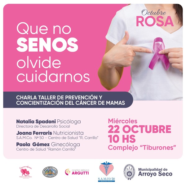El encuentro, titulado “Que no SENOS olvide cuidarnos”, contará con las disertaciones de Natalia Spadoni (psicóloga y directora de Desarrollo Social), Joana Ferraris (nutricionista del Samco N°50 y del Centro de Salud “Ramón Carrillo”) y Paola Gómez (ginecóloga del Centro de Salud “Ramón Carrillo”).