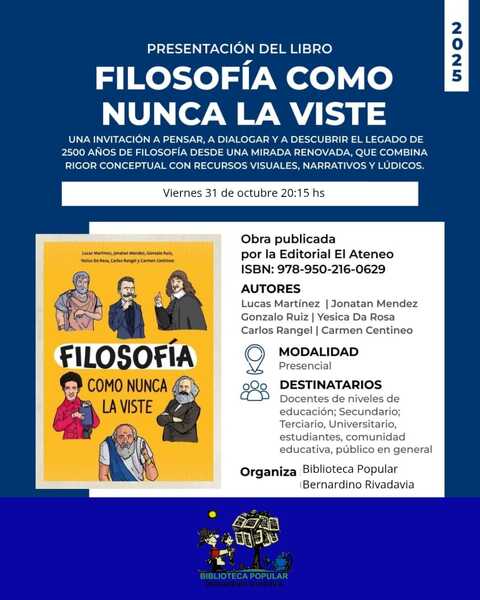 Este viernes a las 20:15 horas, la Biblioteca Popular de Arroyo Seco será escenario de la presentación del libro “Filosofía como nunca la viste”, una obra colectiva escrita por Lucas Martínez, Jonatan Méndez, Gonzalo Ruiz, Yesica Da Rosa, Carlos Rangel y Carmen Centineo.