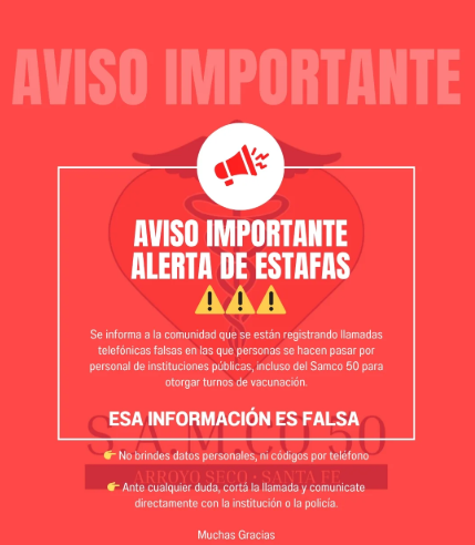 El SAMCo Arroyo Seco emitió un aviso importante a la comunidad para advertir sobre la circulación de llamadas telefónicas falsas en las que personas se hacen pasar por personal del centro de salud o de otras instituciones públicas con el fin de otorgar falsos turnos de vacunación.