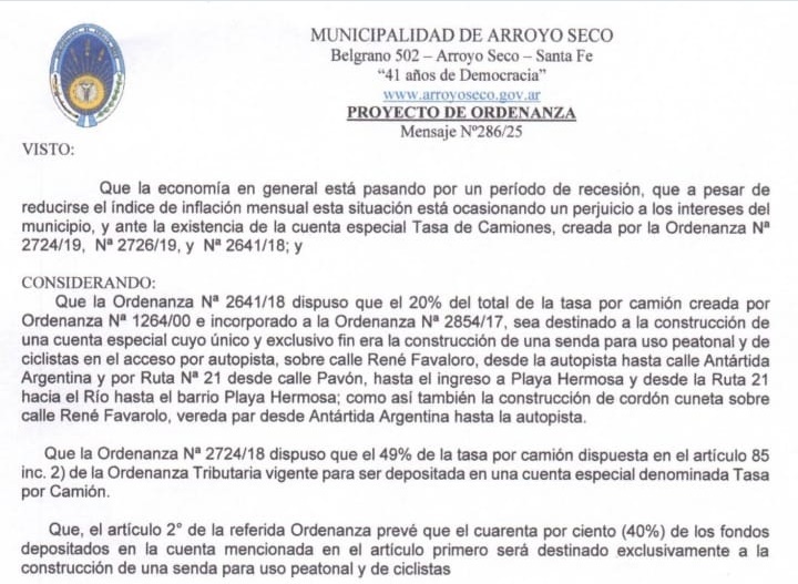 El Ejecutivo municipal volvió a pedir al Concejo de Arroyo Seco la autorización para desafectar fondos de la tasa por ingreso de camiones, una cuenta especial creada por ordenanza para financiar obras públicas. En esta oportunidad, el monto solicitado asciende a 350 millones de pesos, según el Mensaje N° 286/25, firmado por la secretaria de Hacienda Vanina Brancatto y el intendente Daniel Tonelli.
