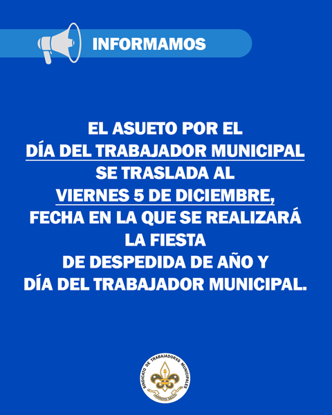 El Sindicato de Trabajadores Municipales informó que el asueto por el Día del Trabajador Municipal será trasladado al viernes 5 de diciembre, jornada en la que además se llevará a cabo la fiesta de despedida de año.