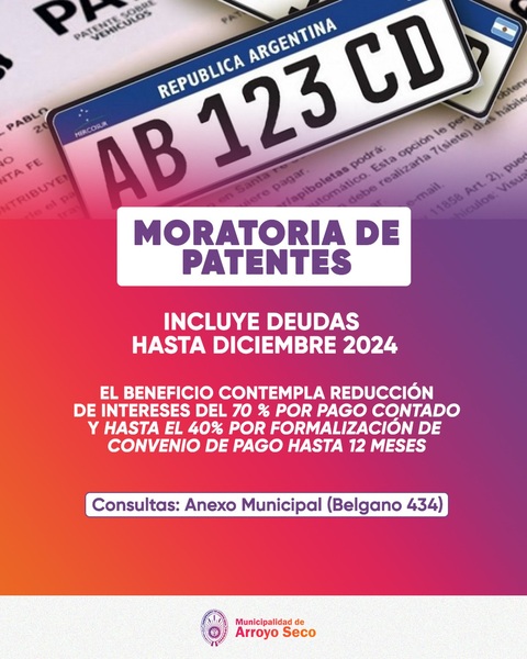 La Municipalidad de Arroyo Seco a través de la Secretaría de Hacienda comunica que durante todo el mes de diciembre se encuentra vigente la Moratoria para Regularización de Deuda de Patente hasta el año 2024.