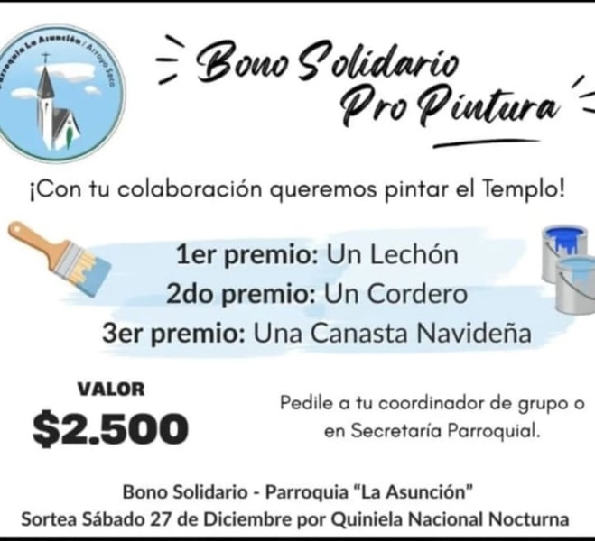 El bono tiene un valor de 2.500 pesos y ofrece importantes premios: el primer premio es un lechón, el segundo un cordero y el tercero una canasta navideña. Los interesados pueden adquirirlo a través de su coordinador de grupo o en la Secretaría Parroquial.