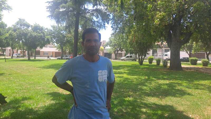 Marcelo Olivera tiene 41 años y desde hace ocho días se encuentra en situación de calle en la Plaza San Martín de Arroyo Seco, luego de quedar varado durante un extenso viaje que inició desde Ushuaia con destino final en Villa Guillermina, en el norte de la provincia de Santa Fe.