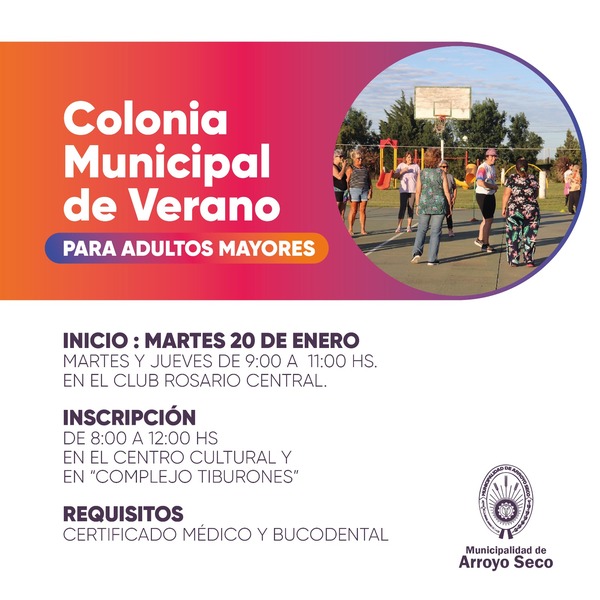 La Municipalidad de Arroyo Seco informó que se encuentra abierta la inscripción para la Colonia Municipal de Verano destinada a adultos mayores.