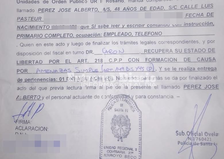 Se trata de José Alberto Pérez, de 48 años, domiciliado en calle Luis Pasteur al 800, quien aseguró que fue trasladado a sede policial junto a otro vecino sin que se les explicaran de manera clara las razones de la medida. Según consta en la documentación a la que tuvo acceso este medio, a Pérez se le formó causa por “amenazas simples”, aunque en los papeles entregados posteriormente no figuran datos de la persona supuestamente amenazada ni mayores precisiones sobre el hecho imputado.