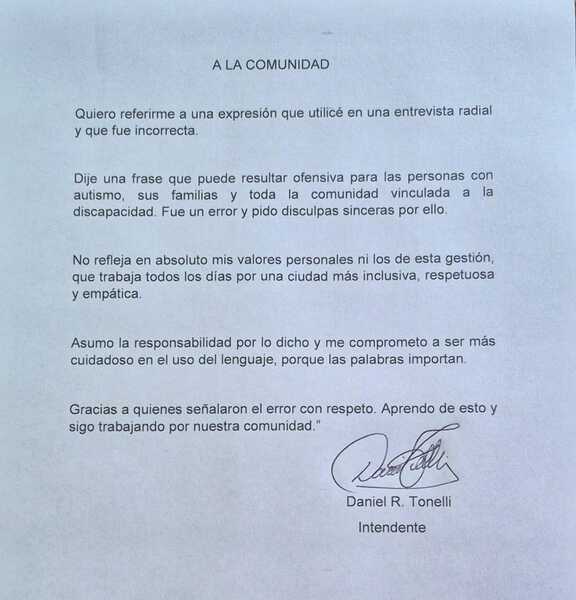 En el texto, Tonelli reconoció que utilizó una frase incorrecta y admitió que sus palabras pudieron resultar ofensivas para las personas con autismo, sus familias y toda la comunidad vinculada a la discapacidad.