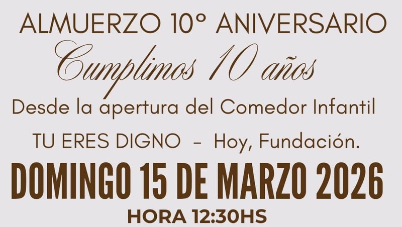 La Fundación Tu Eres Digno celebrará su 10° aniversario con un almuerzo especial que se realizará el domingo 15 de marzo de 2026, a las 12:30 horas, en el Centro de Jubilados de Arroyo Seco, ubicado en la intersección de Mansueto Maiorano y H. Irigoyen.