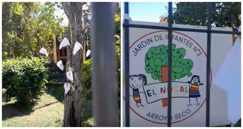 Un vecino de Arroyo Seco cuestionó la presencia de pañuelos blancos en la fachada de la institución de calle Mitre. El hecho trae al recuerdo la controversia nacional que protagonizó el mismo jardín en 2021 con una personificación de Estela de Carlotto.