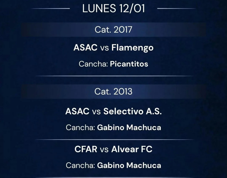 En categoría 2017, jugarán Athletic frente a Flamengo. En la 2013, habrá dls cotejos que serán Athletic contra Selectivo A.S. y otro partido será CFAR ante Alvear F.C.