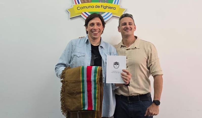 Esta nueva visita ocurrió el pasado martes, cuando fue recibido por el presidente comunal Rodolfo Stangoni, a quien el legislador le obsequió un poncho gauchesco y una copia de la recientemente reformada Constitución Provincial. Un gesto simbólico, aunque la carta magna ya puede descargarse por internet o adquirirse en cualquier librería.