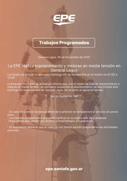 La Empresa Provincial de la Energía (EPE) anunció que este domingo 9 de noviembre, de 07:00 a 12:00, se efectuarán tareas de mantenimiento y mejoras en media tensión en la localidad de General Lagos.