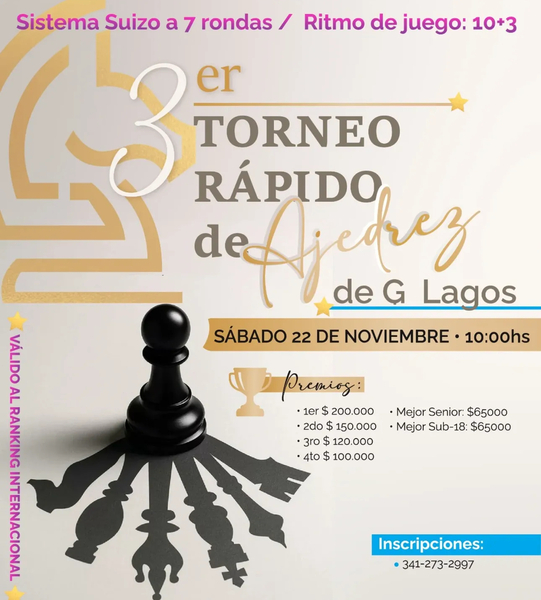 Durante este mes de Noviembre, se vendrá la 3era edición del Torneo Rápido de Ajedrez para la localidad de General Lagos.