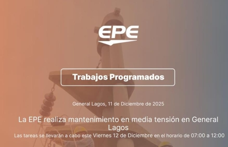 Según detalló la EPE, las labores se desarrollan durante la jornada de hoy, viernes 12 de diciembre, en el horario comprendido entre las 7 y las 12, motivo por el cual fue necesario interrumpir de manera transitoria el suministro eléctrico en algunos sectores de la localidad.