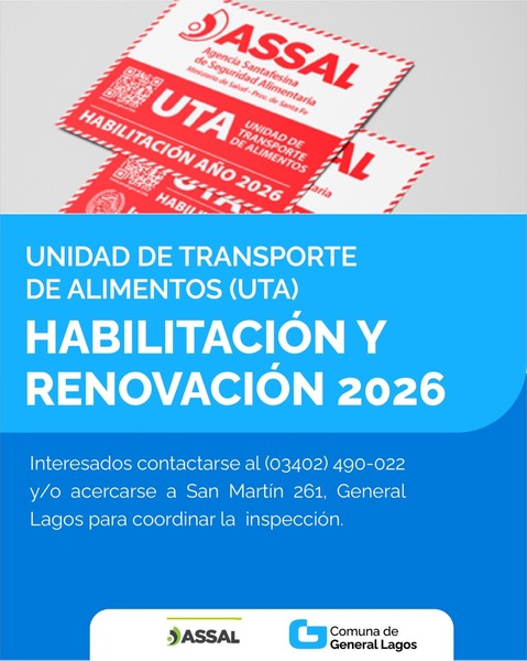 La Comuna de General Lagos informa que se encuentra habilitado el trámite de emisión y renovación de la Unidad de Transporte de Alimentos (UTA) para el año 2026.