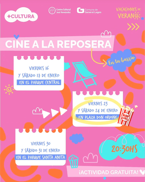Este viernes a partir de las 20:30 hs, se llevará a cabo una nueva jornada de este ciclo fílmico llamado “Cine a la reposera” en General Lagos.