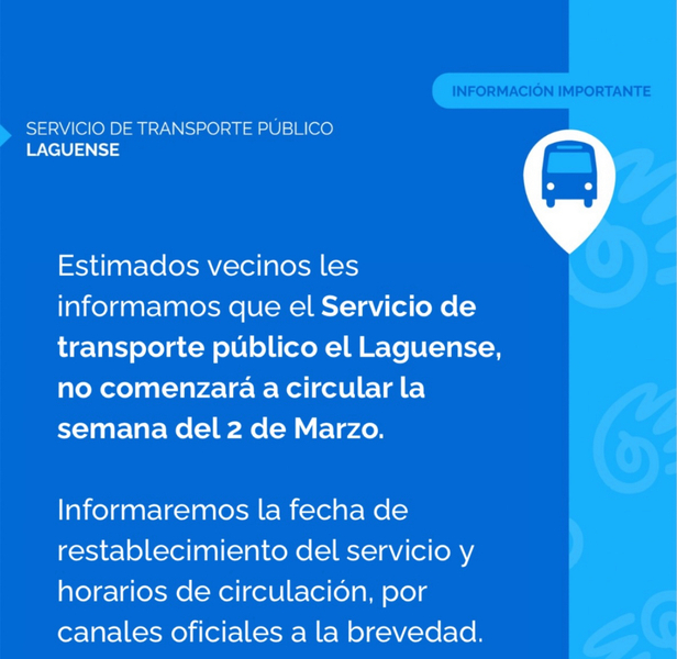 Es por eso que la Comuna tras su comunicado expresó que todavía no hay una fecha exacta de cuando el servicio de transporte “El Laguense” vuelva a ser utilizado con normalidad.
