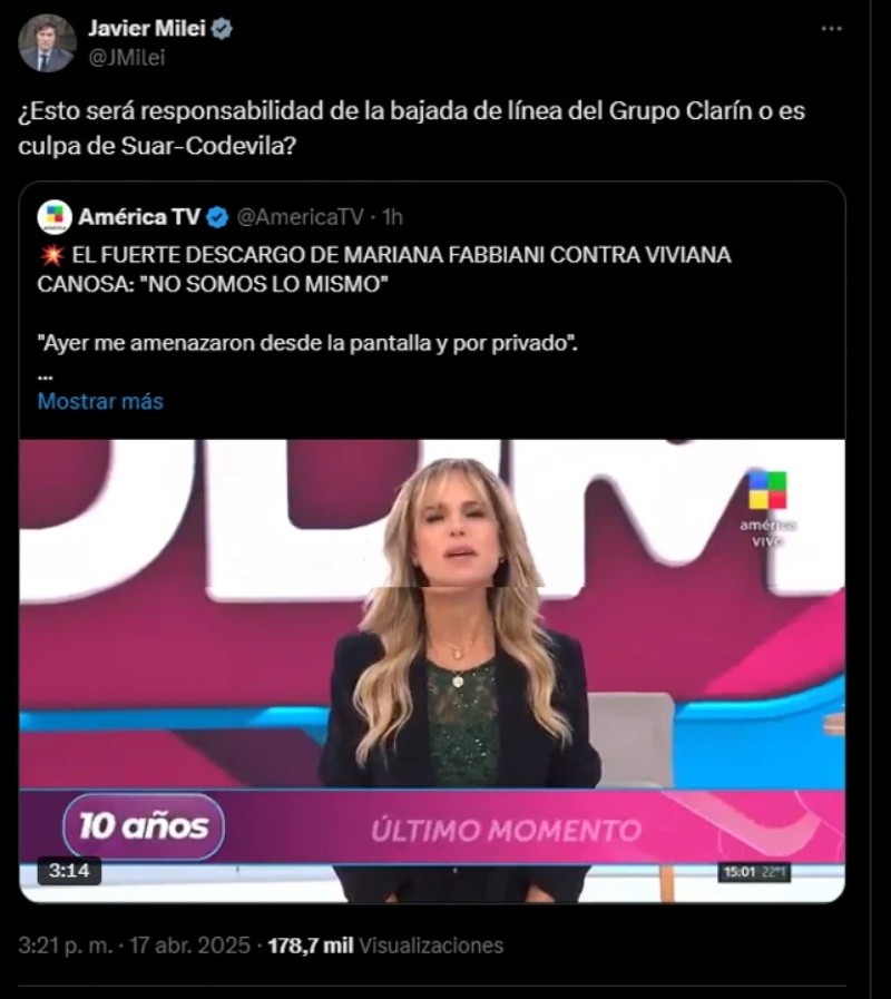 Milei publicó en su cuenta oficial de X (ex Twitter): “¿Esto será responsabilidad de la bajada de línea del Grupo Clarín o es culpa de Suar-Codevila?”, en clara alusión al conflicto televisivo que se desató tras los dichos de Canosa y el fuerte descargo que Fabbiani en América TV.