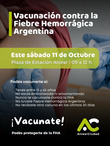 Este sábado 11 de octubre, de 9 a 12 horas, se realizará una jornada de vacunación contra la Fiebre Hemorrágica Argentina (FHA) en la Plaza de Estación Alvear.