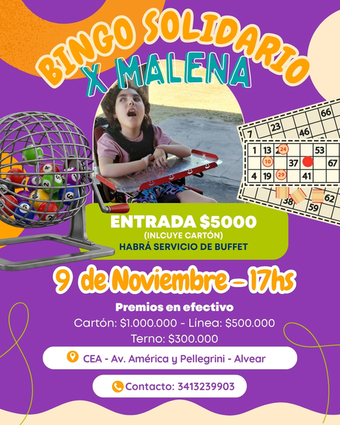 El próximo sábado 9 de noviembre a las 17 horas se llevará a cabo un Bingo Solidario por Malena, con importantes premios en efectivo y servicio de buffet. El evento tendrá lugar en el CEA, ubicado en Av. América y Pellegrini, en la localidad de Alvear.