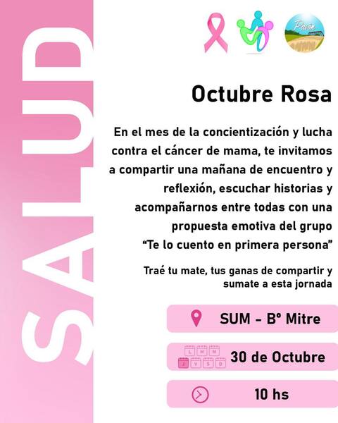 En el marco del mes de la concientización y lucha contra el cáncer de mama, la Comuna de Pavón invita a la comunidad a participar de una Jornada Rosa que se realizará el jueves 30 de octubre a las 10:00 horas en el SUM del Barrio Mitre.