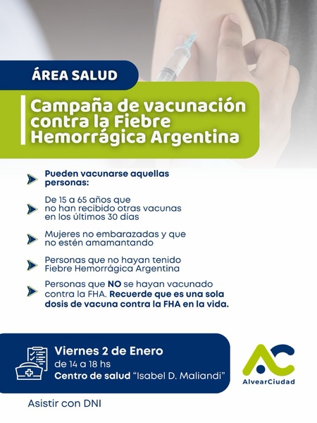 El Área de Salud de la Municipalidad de Alvear anunció una nueva campaña de vacunación contra la Fiebre Hemorrágica Argentina (FHA), destinada a prevenir una enfermedad endémica de la región.