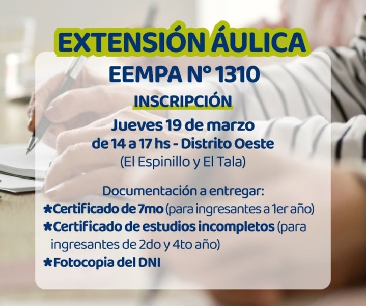 La ciudad de Alvear informó que este jueves 19 de marzo se realizará la inscripción para la extensión áulica de la EEMPA N° 1310, destinada a jóvenes y adultos que deseen iniciar o continuar sus estudios.